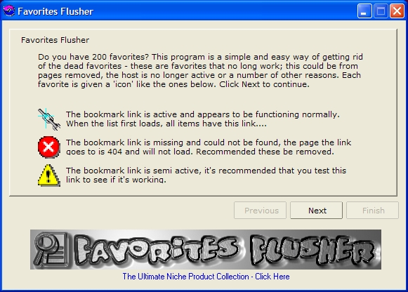 お気に入りフラッシャーが、お気に入りフォルダーに入っているすべてのリンクが、現在も有効かどうかを1つ1つチェックし、リンク切れを見つけて一覧表示してくれます。